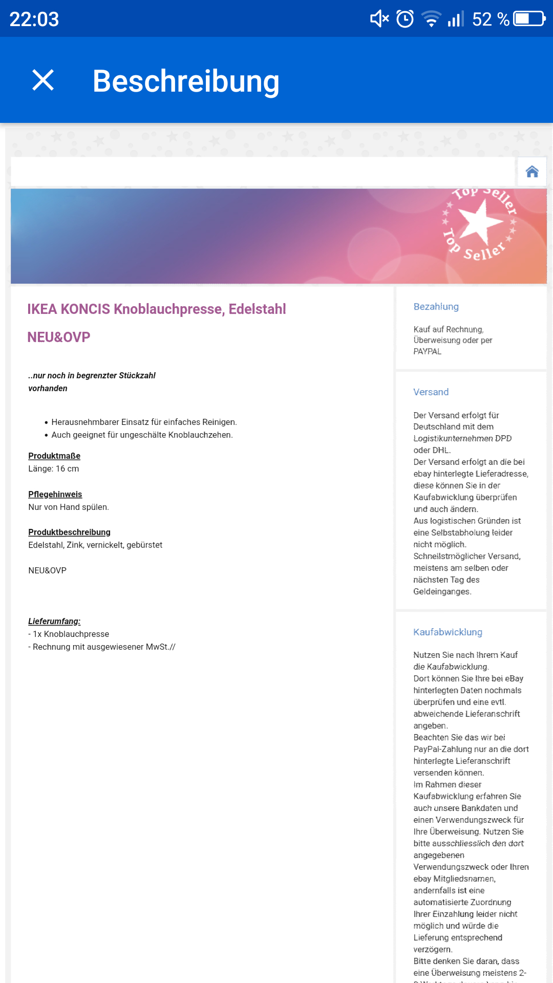 Wird die mobile Kurzbeschreibung bei eBay nicht im Angebot definiert, heisst das nicht dass sie nicht angezeigt wird. eBay blendet dann einfach zusammenhanglose Textausschnitte ein, die als Vorschau einer Artikelbeschreibung denkbar ungeeignet sind. Wie im nebenstehenden Beispielbild ersichtlich ist, ist die mobile Kurzbeschreibung die ideale Stelle, um mit dem USP des Produktes zu überzeugen - oder eben auch nicht.